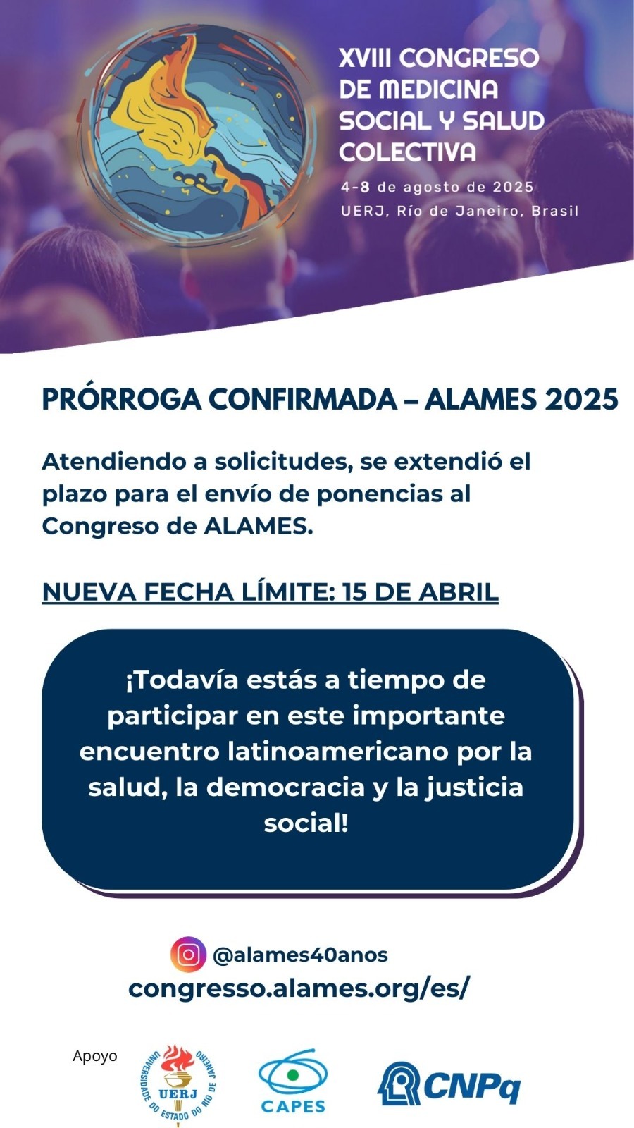 En respuesta a las solicitudes, se amplió el plazo para la presentación de trabajos al XVIII Congreso de Medicina Social y Salud Colectiva hasta el 15 de abril de 2025.