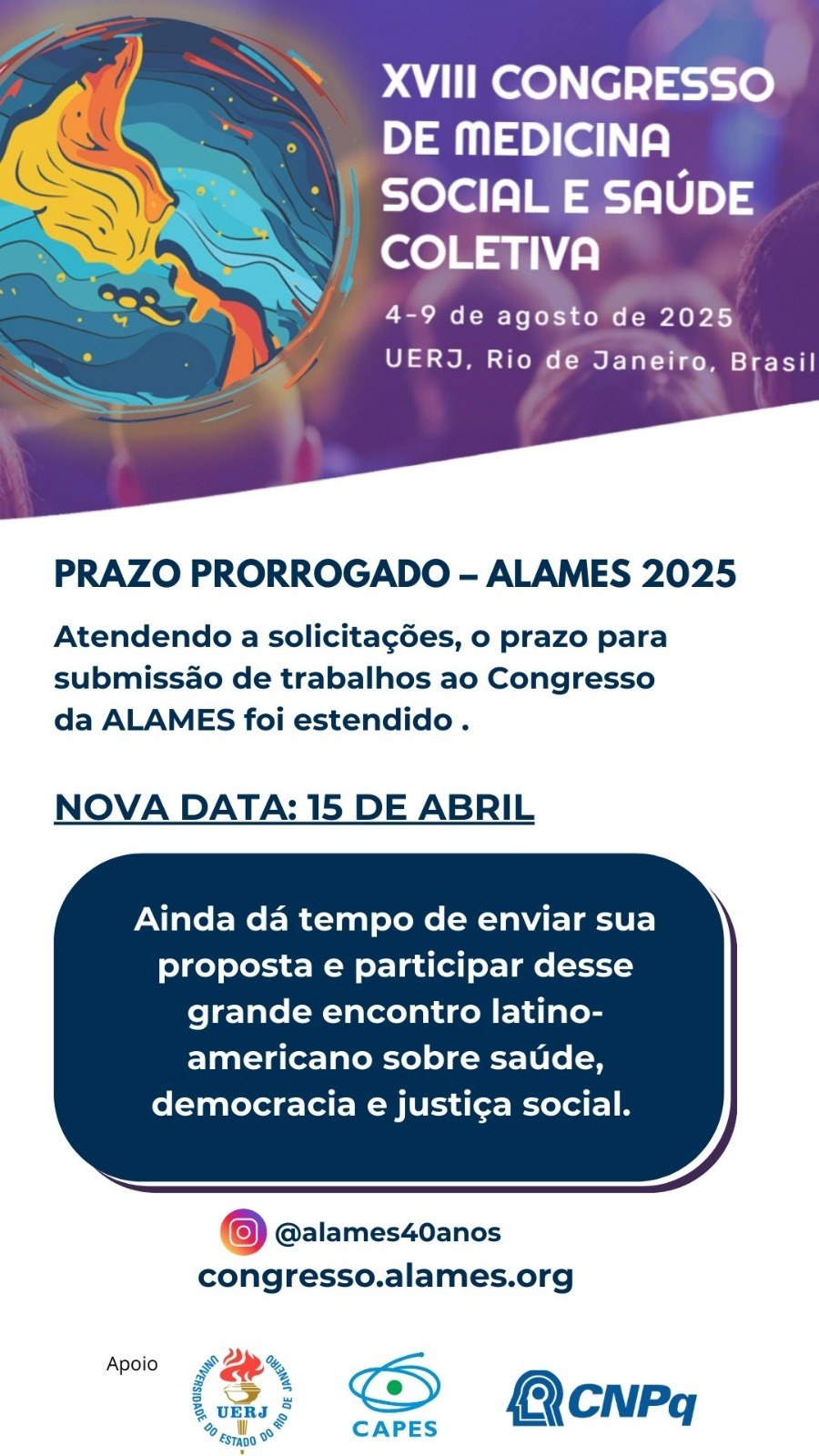 Atendendo a solicitações, o prazo para submissão de trabalhos ao XVIII Congresso de Medicina Social e Saúde Coletiva foi estendido até 15 de abril de 2025.